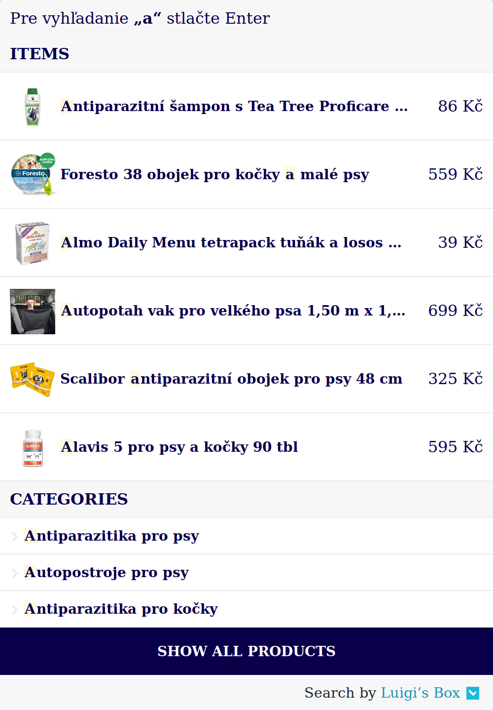 Luigi's Box Autocomplete is a feature designed to show customers relevant, real-time results from their very first keystroke. The system is highly optimized for speed (latency), providing an instant and seamless user experience. It learns from user behavior through analytics integration to continuously improve the relevance of its suggestions. To accommodate different development needs, Autocomplete can be integrated in two primary ways. You can use Autocomplete.js, a comprehensive JavaScript widget that handles all functionality out of the box, or the core Autocomplete API for a fully custom implementation.